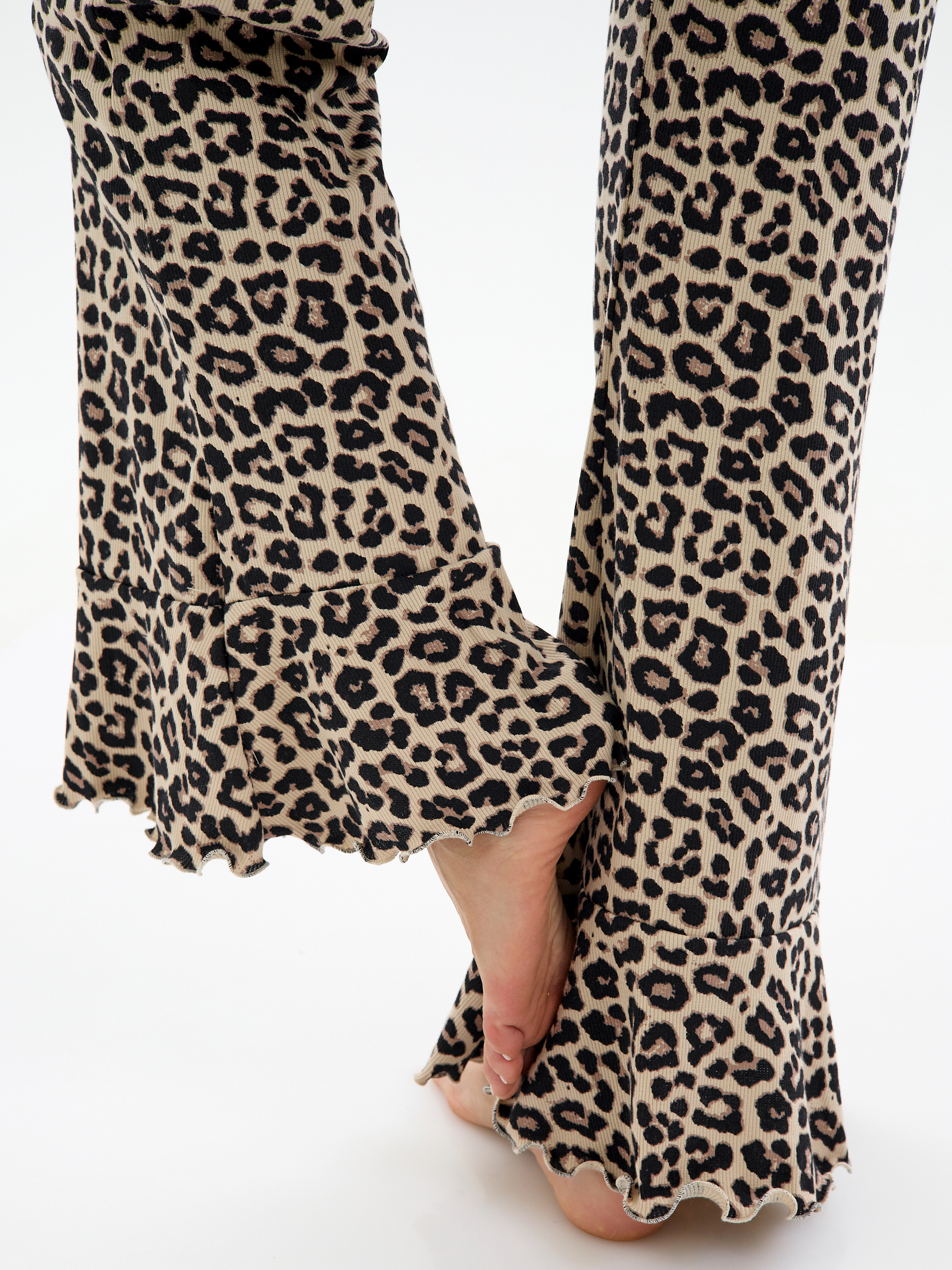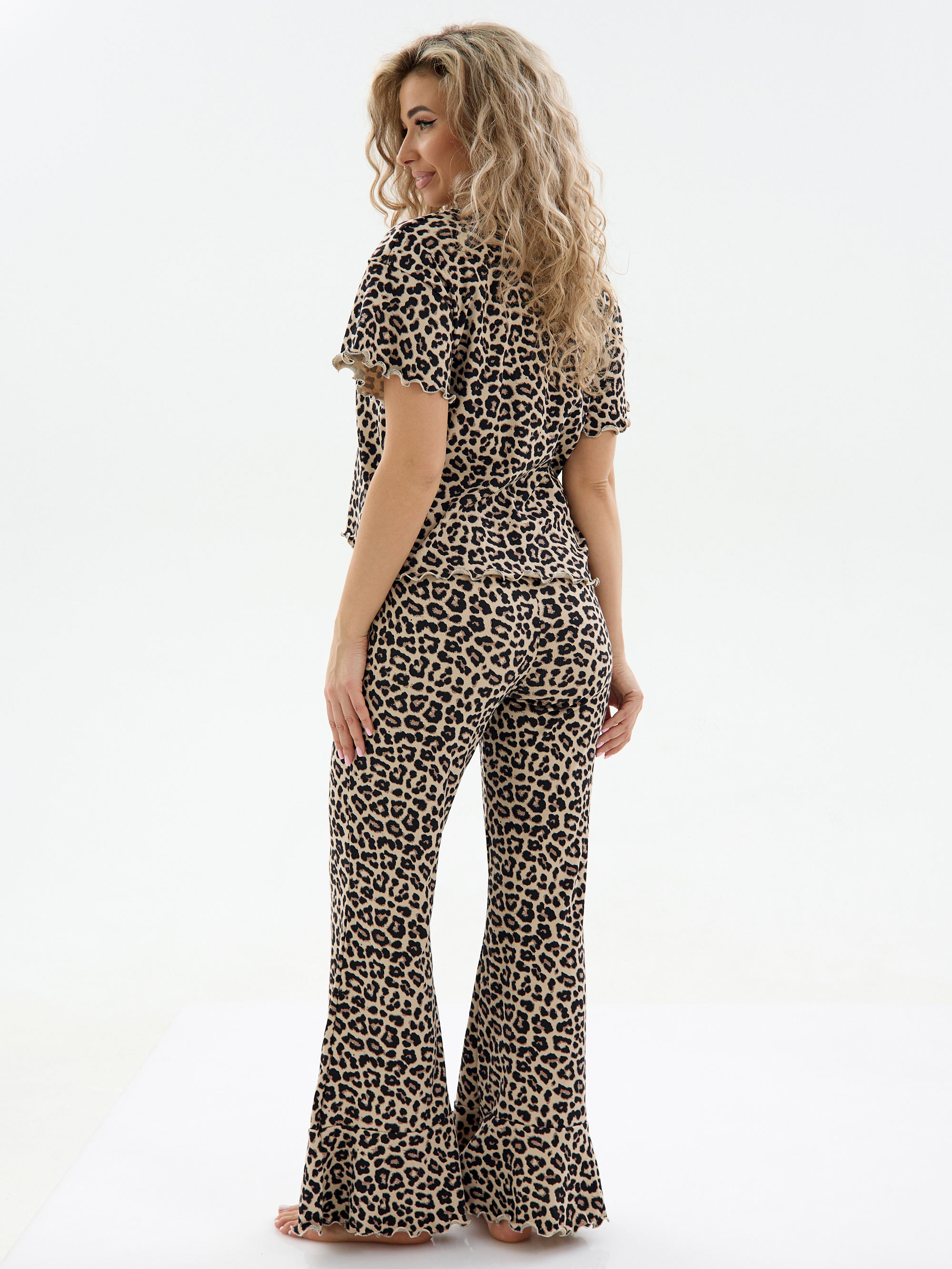 Наш красивый и стильный трикотажный оверсайз костюм в рубчик с леопардовым принтом станет вашим любимым выбором. Футболка с коротким рукавом и штаны палаццо с широкими штанинами с воланами создают уникальный и модный образ, который выделит вас среди других. Длинная трикотажная пижама из мягкой ткани представлена в разных размерах, которые подойдут каждому - от больших размеров до размеров для женщин с более миниатюрной фигурой.